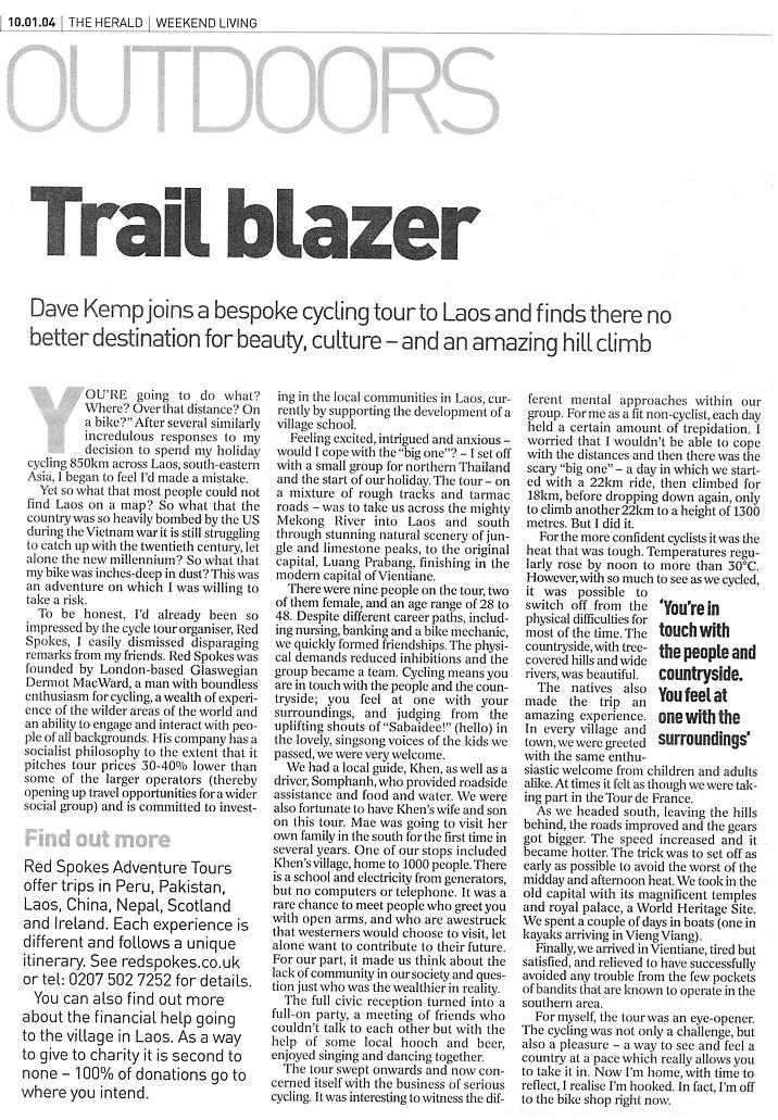 TheHerald newspaper in Scotland featured an article on our bespoke cycling tour of Laos and is well worth a read. For mor einformation on our Laos Cycling Holidays and bespoke tours, please visit our Laos Cycling Holiday page to see what we have to offer.